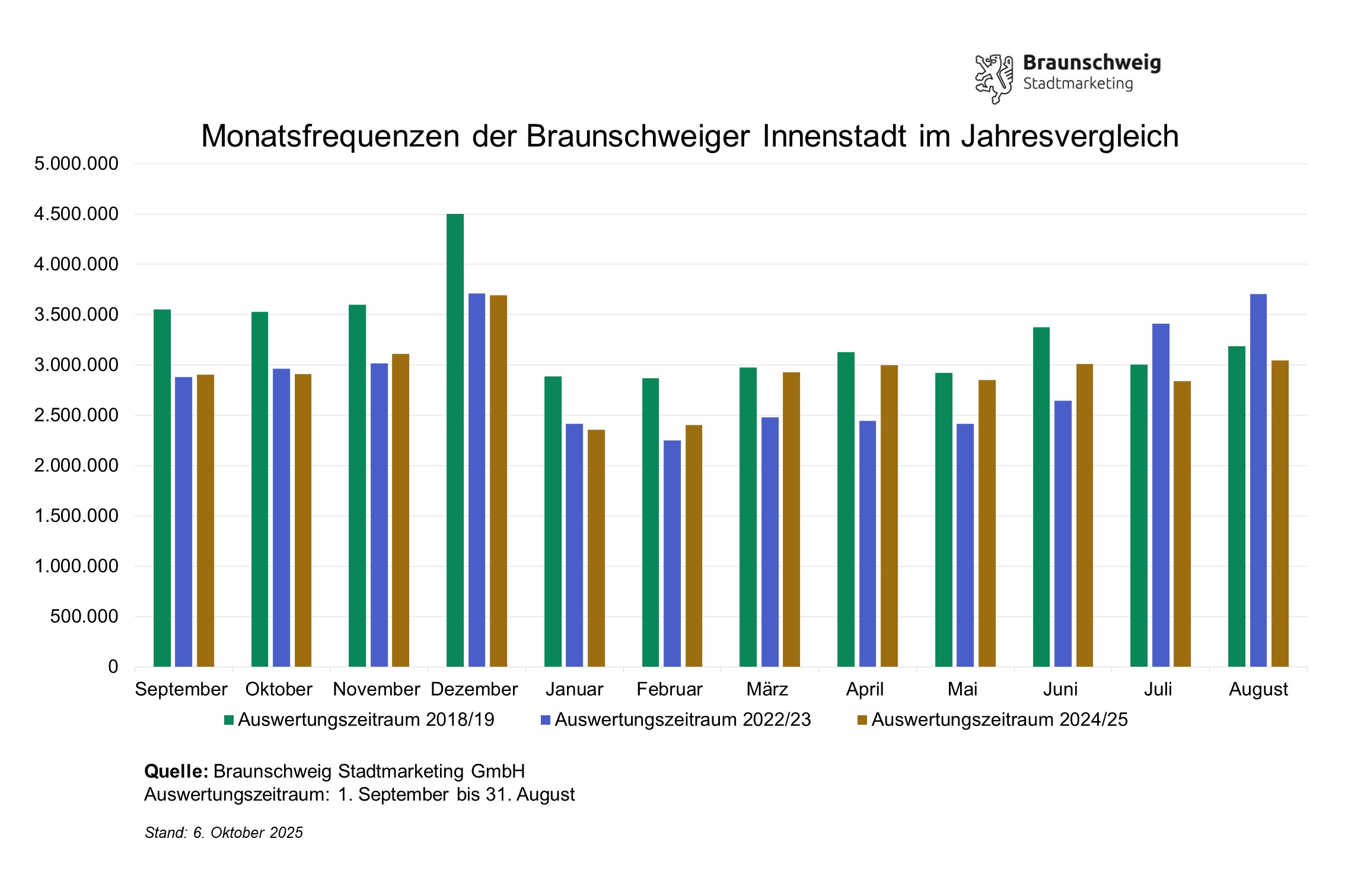Die frequenzstärksten Monate für 2024/2025 fallen in den Winter und insbesondere in die Adventszeit. Durch die Weihnachtseinkäufe und den beliebten Braunschweiger Weihnachtsmarkt hebt sich der Dezember mit etwa 4,2 Millionen Frequenzen deutlich als stärkster Monat des Jahres ab. Während die Monate September bis Februar im jahresübergreifenden Vergleich ähnliche Frequenzen aufweisen, war die Entwicklung im Frühjahr 2025 sehr positiv mit stärkeren Frequenzen als 2023.