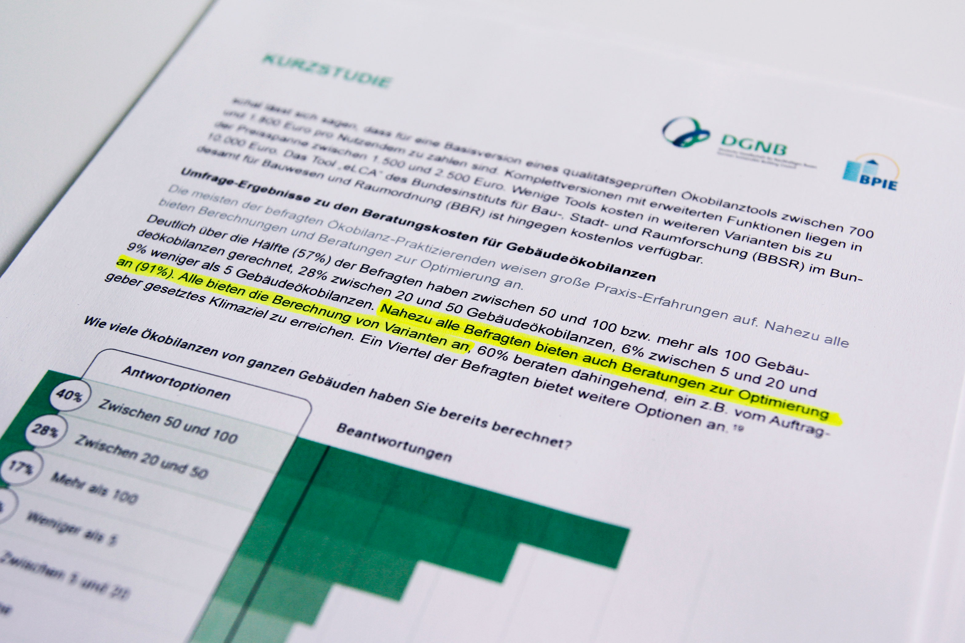 Um Evidenzen in die Diskussionen rund um die Ökobilanzierung von Gebäuden zu bringen, hat die Deutsche Gesellschaft für Nachhaltiges Bauen (DGNB) in Zusammenarbeit mit dem Buildings Performance Institute Europe (BPIE) eine Kurzstudie durchgeführt. Diese macht deutlich, dass die Relevanz der Methodik immer mehr zunimmt. Viele Unternehmen haben bereits Expertise aufgebaut, es gibt vielfältige Qualifizierungsmöglichkeiten und es sind zahlreiche Tools zur Berechnung von Gebäudeökobilanzen verfügbar. Gleichzeitig zeigt die Erhebung, dass die anfallenden Beratungskosten stark variieren, abhängig unter anderem von der Datenverfügbarkeit. Einsparpotenziale bieten die Anwendung von BIM (Building Information Modelling) sowie eine bessere Standardisierung der Methoden und Datengrundlagen.