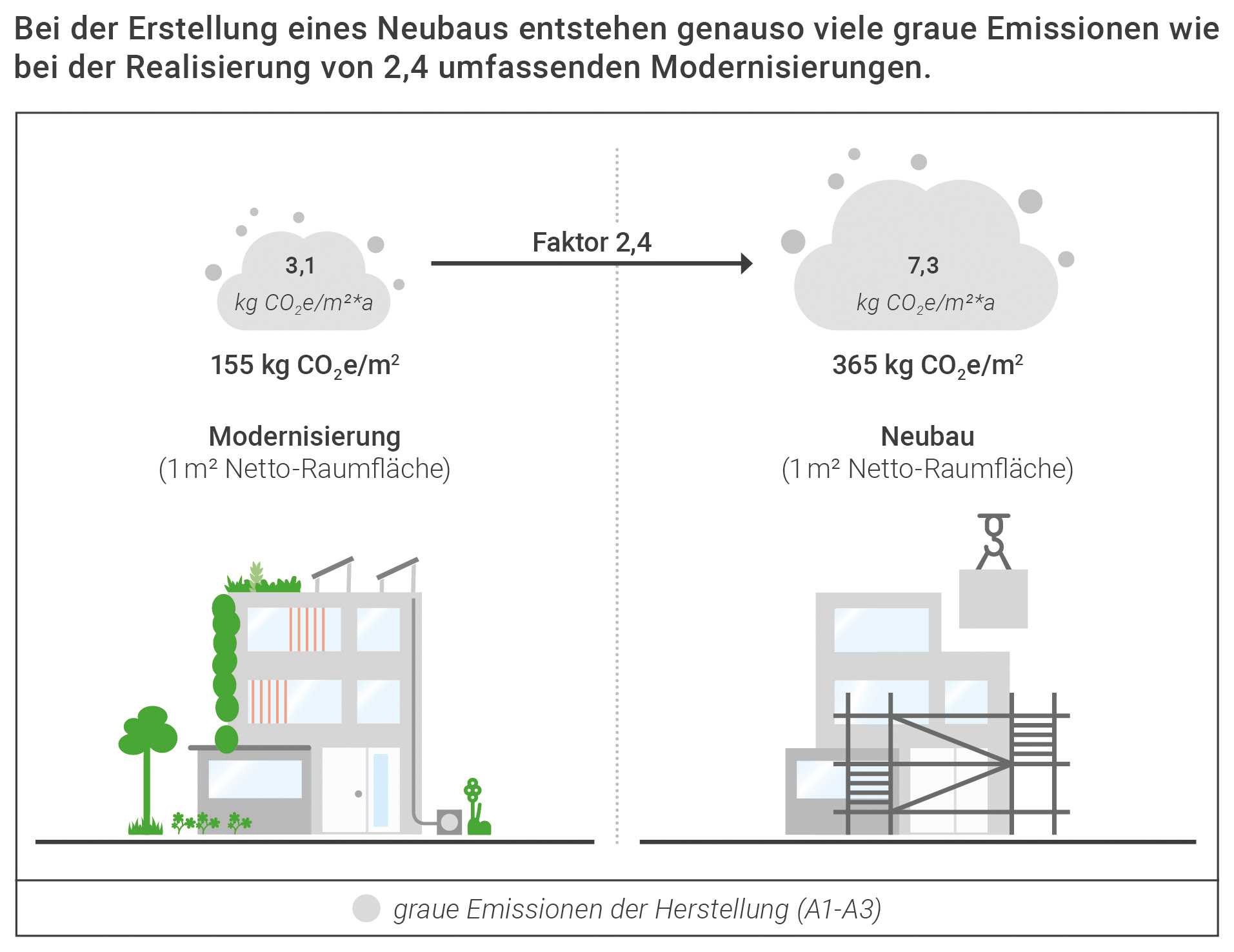 Sanierung schlägt Neubau – zumindest mit Blick auf die Klimawirkungen: Dies ist ein zentrales Ergebnis einer Kurzstudie der Deutschen Gesellschaft für Nachhaltiges Bauen (DGNB). In der Analyse wurden bei 19 DGNB-zertifizierten Sanierungsprojekten die CO₂-Emissionen über den Gebäudelebenszyklus untersucht. Eine Erkenntnis: Die bauwerksbezogenen Emissionen liegen bei Neubauten in der Regel so viel höher als bei Sanierungen, dass sie sich durch geringere Umweltwirkungen in der Nutzungsphase nicht vollständig kompensieren lassen. Die Erhebung zeigt außerdem, dass sich frühe Modernisierungen lohnen, es aber kein Patentrezept gibt, welche Form der Sanierung für ein Gebäude die geeignetste ist.